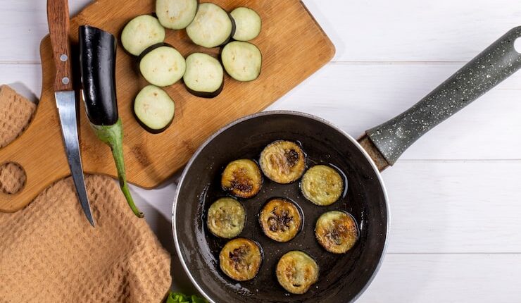 Помните, что синенькие быстро впитывают масло, поэтому не передерживайте их на сковороде. Готовые кружочки выложите на бумажное полотенце, чтобы удалить лишний жир.