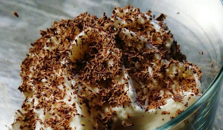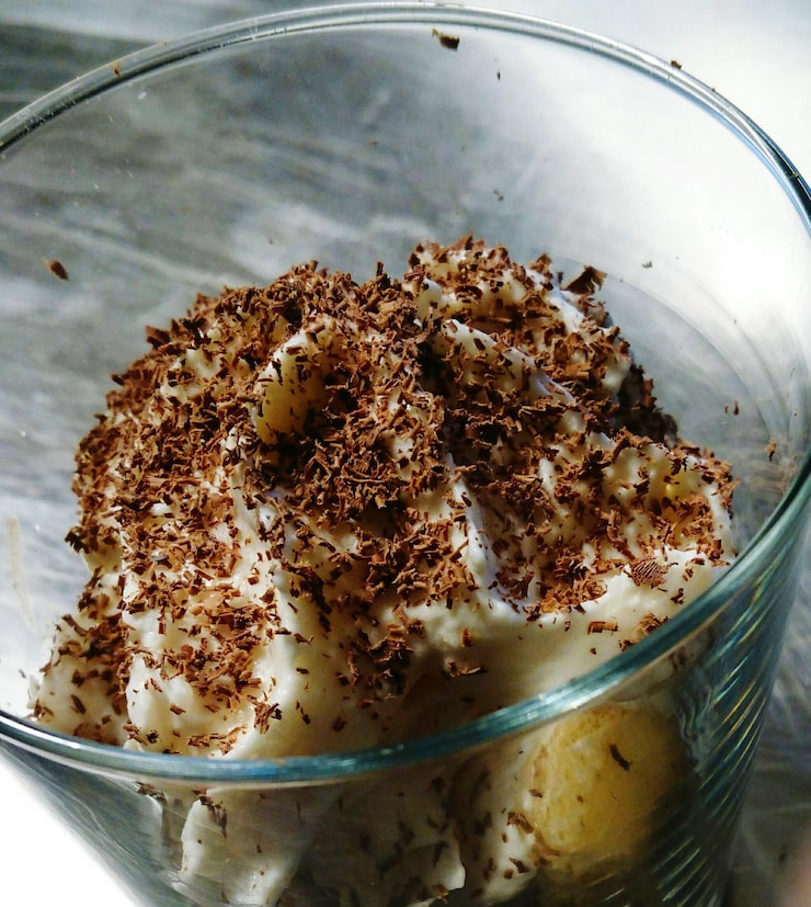 Пока фрукт греется, натрите горький шоколад на мелкой терке. Как только фрукт будет готов, выньте его из микроволновки и положите на тарелку. Сверху выложите тертый шоколад и дайте ему растаять на горячем фрукте.