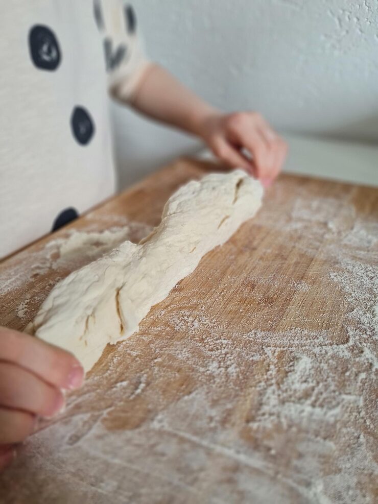 Последний раз раскатайте тесто в прямоугольник толщиной около 5 миллиметров. Разрежьте его на квадраты или треугольники, в зависимости от того, что вам нужно.