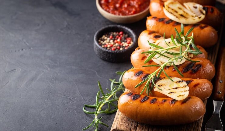 Теперь перейдем к приготовлению сосисок. Для этого вам понадобятся фарш (например, свиной или говяжий), лук, чеснок, соль и перец. Смешайте фарш с мелко нарезанным луком и чесноком, добавьте соль и перец по вкусу. Сформируйте из фарша небольшие шарики и заверните их в полоски теста, плотно скрепив края.