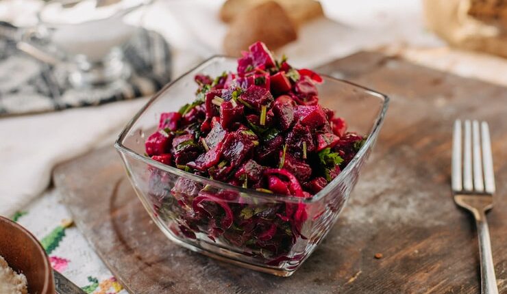 Начните с приготовления свеклы. Очистите ее и нарежьте кубиками. Отварите свеклу до мягкости в подсоленной воде. После того, как свекла готова, слейте воду и отставьте свеклу в сторону.
