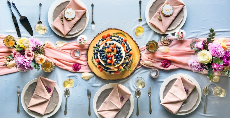 Для сервировки стола используйте качественную посуду и текстиль. Белое постельное белье и салфетки создают чистый и элегантный фон, а цветные тарелки и бокалы добавляют яркости и индивидуальности.