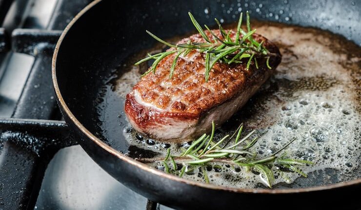Для жарки используйте сковороду с толстым дном и стенками. Разогрейте ее на сильном огне, добавьте немного масла и только тогда кладите мясо. Жарьте его без крышки, чтобы образовалась аппетитная корочка. Переворачивайте кусок только один раз, чтобы не выпустить соки.
