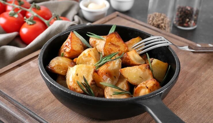 Поставьте форму в печь и готовьте в течение 25-30 минут или до тех пор, пока картофель не станет мягким, а мясо не будет готово. Не забудьте перевернуть ингредиенты примерно через 15 минут, чтобы они равномерно подрумянились.