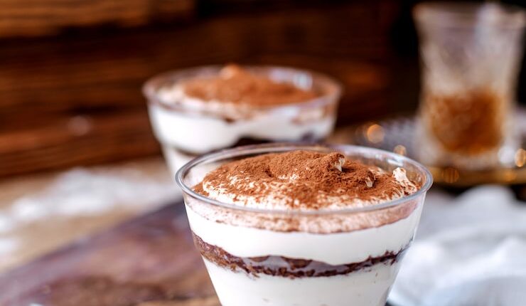 Перед подачей посыпьте десерт какао-порошком и украсьте листочками мяты или ягодами по желанию.