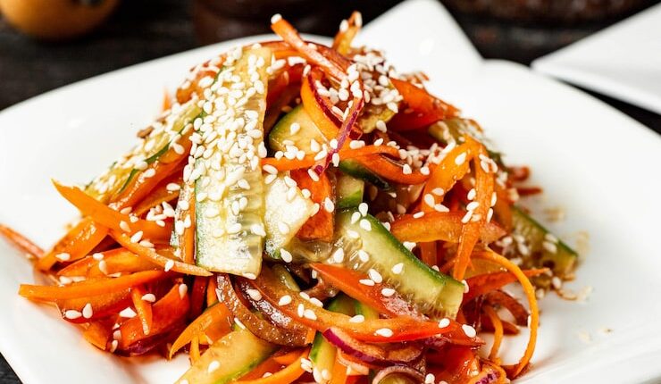 Теперь настало время собрать все ингредиенты воедино. Нарежьте морковь и редьку тонкими полосками, а грибы — тонкими ломтиками. Смешайте овощи и грибы в большой миске и залейте их заправкой. Хорошо перемешайте, чтобы все ингредиенты были равномерно покрыты соусом.