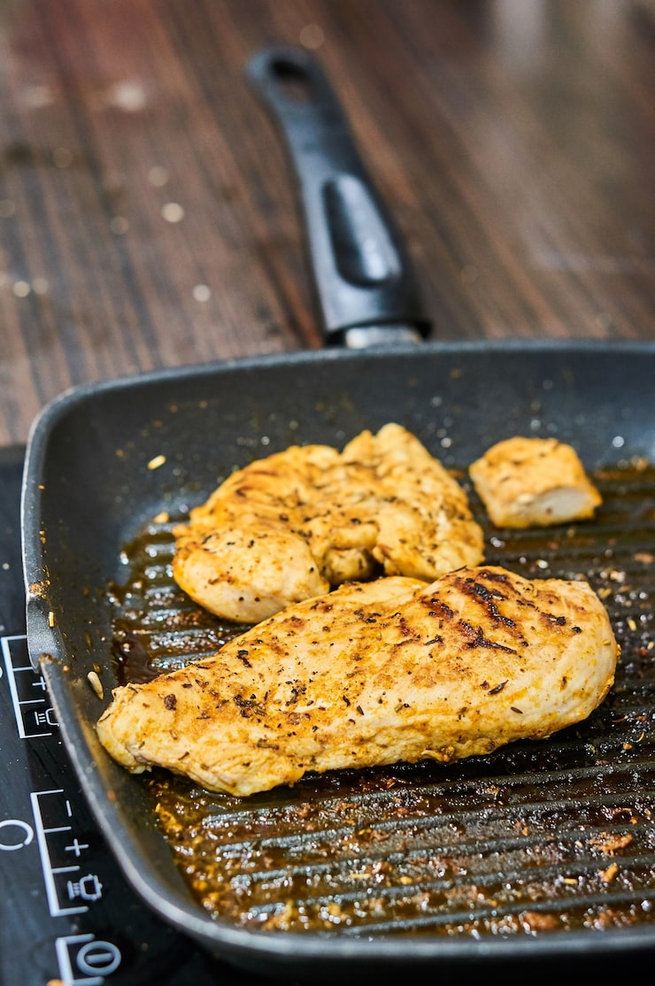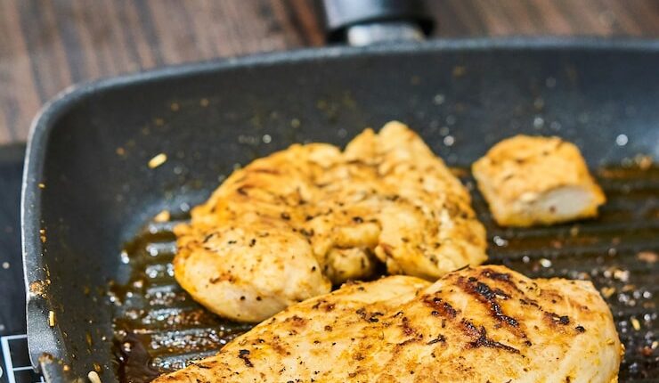 Когда масло раскалится, аккуратно поместите курицу в сковороду. Жарьте каждую сторону до золотистой корочки и готовности. В среднем, это занимает около 5-7 минут с каждой стороны.