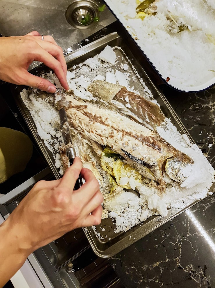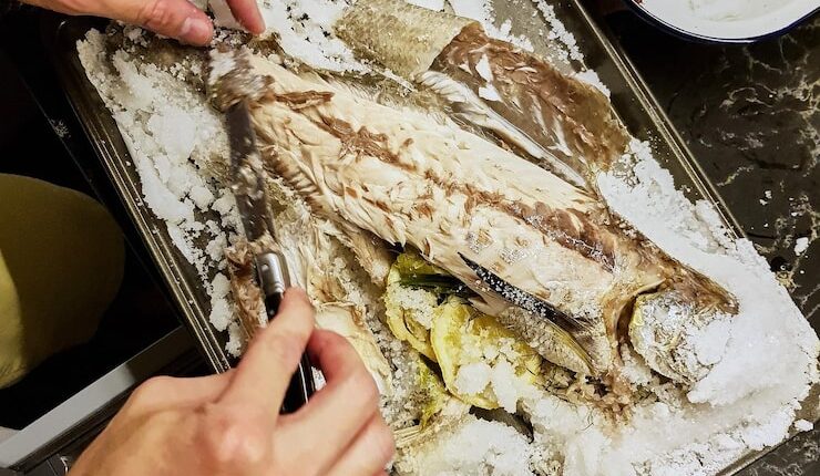 Пока рыба маринуется, подготовьте форму для запекания. Застелите дно формы листом фольги, чтобы предотвратить пригорание рыбы. Если вы используете целую рыбу, поместите ее на форму головой к центру. Если вы запекаете порционные куски, разместите их на форме так, чтобы они не соприкасались друг с другом.