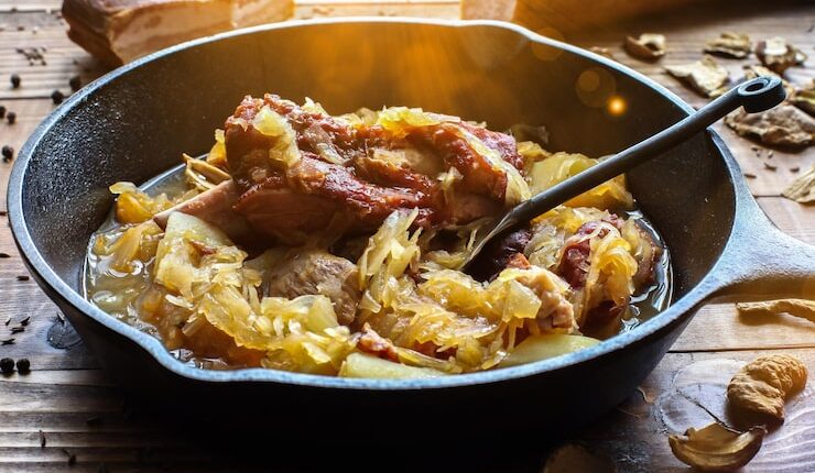 Начните с разогрева оливкового масла в кастрюле на среднем огне. Добавьте лук и чеснок, обжаривайте до золотистого цвета. Затем добавьте квашеную капусту и жарьте еще несколько минут, чтобы она стала мягкой.