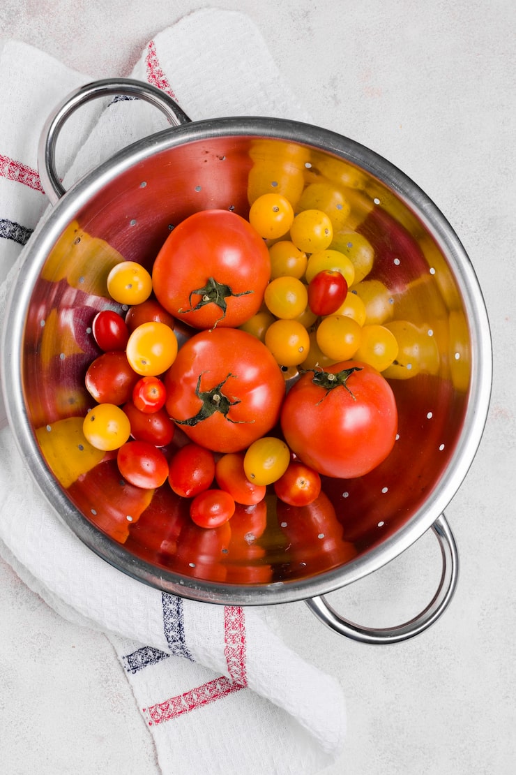 Начните с отбора спелых, но не перезревших томатов. Для этой заготовки лучше всего подходят средние по размеру помидоры. Тщательно вымойте их и удалите зеленые части.