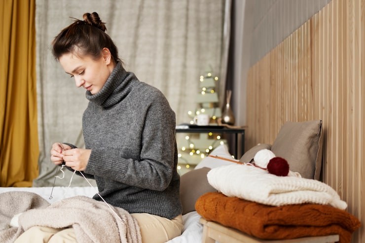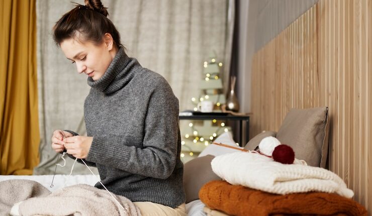 Затем начните вязать ряды. Для простоты можно использовать лицевую гладь — это базовый узор, который легко связать даже новичкам. Вяжите ряды до тех пор, пока длина пледа не достигнет нужного размера.