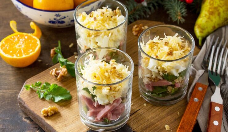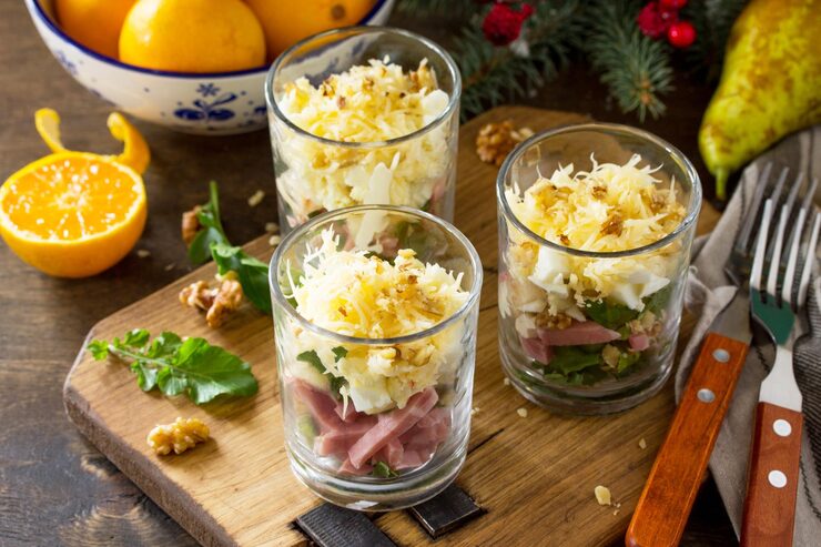 Последний штрих — заправка. Для этого салата мы предлагаем использовать смесь майонеза и сметаны в равных пропорциях. Добавьте туда же немного лимонного сока и ваших любимых специй. Все тщательно перемешайте и заправьте салат перед подачей на стол.