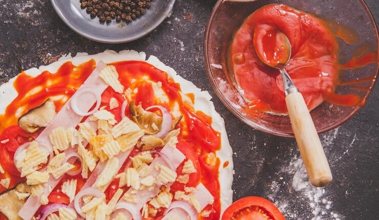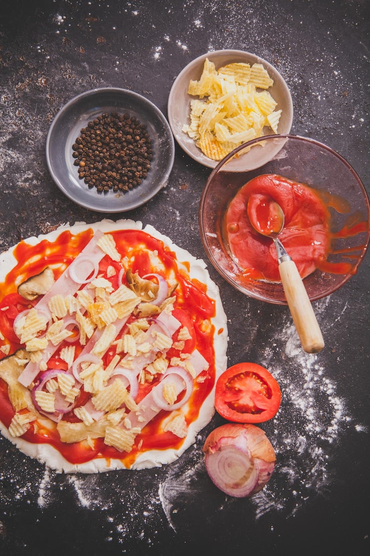 Теперь перейдем к основному ингредиенту — помидорам. Мы будем использовать спелые помидоры, которые придадут пицце неповторимый вкус. Нарежьте помидоры тонкими ломтиками и выложите их на тесто. Не бойтесь добавить побольше помидоров, ведь они придадут пицце сочность и аромат.