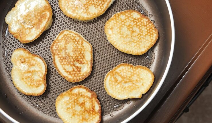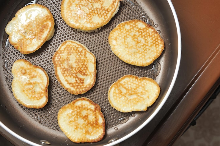 Для жарки блинов используйте сковороду с антипригарным покрытием диаметром 20-25 см. Нагрейте сковороду на среднем огне. Добавьте небольшое количество теста на сковороду, примерно 1/4 стакана, и быстро вращайте сковороду, чтобы тесто равномерно распределилось по дну.