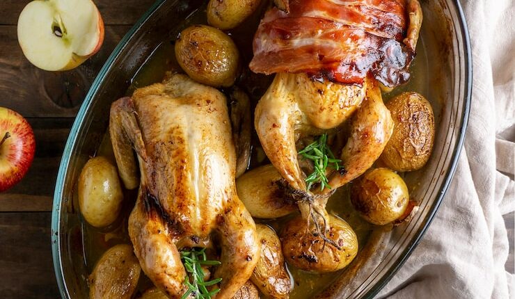 Пока мясо запекается, положите картофель на другой противень и запекайте в течение 45-60 минут или до тех пор, пока картофель не станет мягким и золотистым. Перед подачей можно разрезать картофель пополам и добавить сливочное масло и зелень по вкусу.