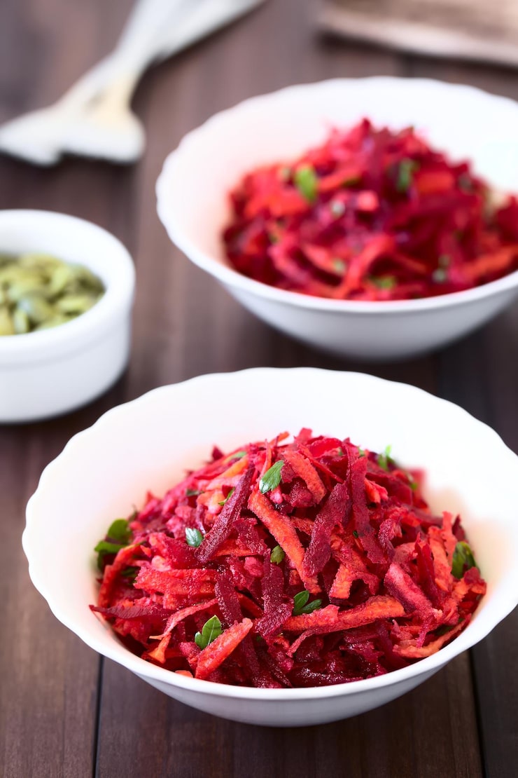 Первый шаг — приготовление отварных корнеплодов. Очистите свеклу и морковь, затем отварите их в течение 20-25 минут, пока они не станут мягкими. После этого дайте им остыть.