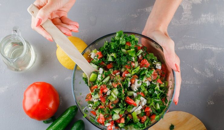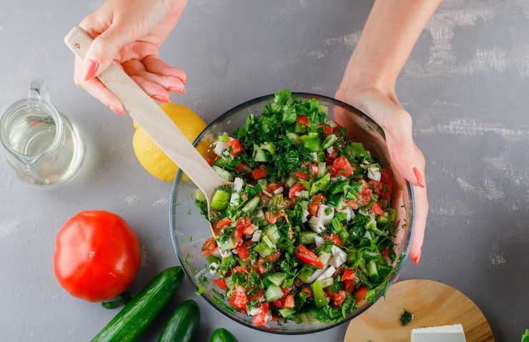 Чтобы салат получился сочным, добавьте в него свежие овощи. Подойдут огурцы, помидоры, болгарский перец, лук и чеснок. Все овощи нужно мелко нарезать или натереть на терке.