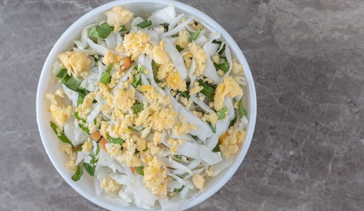 Нарежьте вареные яйца небольшими кубиками и добавьте их в миску с овощами. Заправьте салат соусом и аккуратно перемешайте.