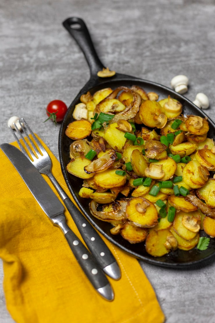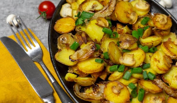 Начните с обжаривания кусочков курицы до золотистой корочки. Затем добавьте нарезанный картофель и обжаривайте до полуготовности. Добавьте грибы и готовьте, пока они не пустят сок. Переложите все в форму для запекания, добавьте специи и отправьте в разогретую печь. Через 20-25 минут ваше блюдо будет готово.