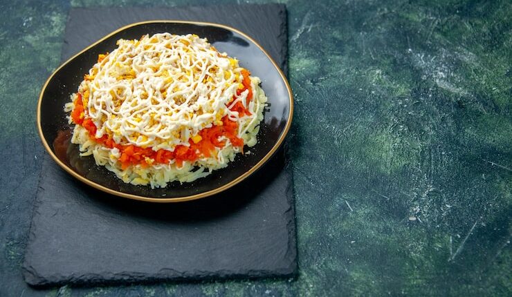 После того, как все слои уложены, пришло время добавить майонез. Вы можете просто полить майонезом верхний слой салата или смешать его с другими ингредиентами перед укладкой. Не забудьте добавить соль и перец по вкусу.