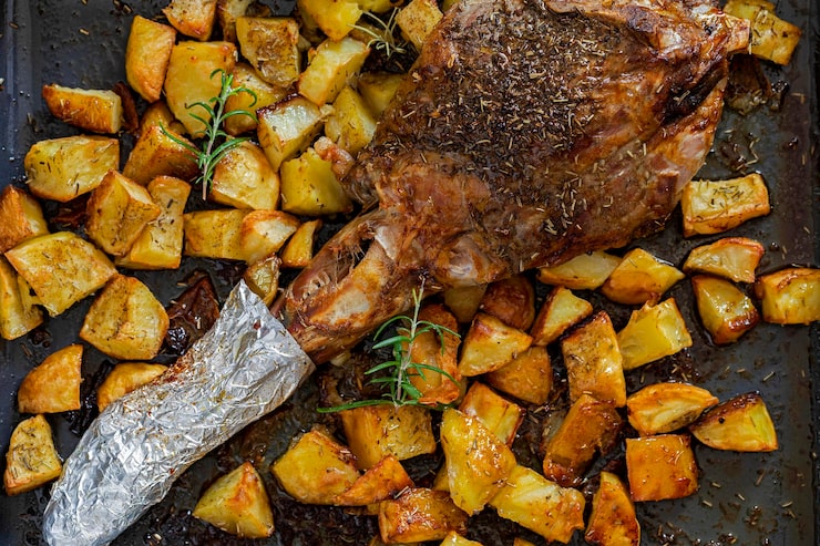 Разогрейте духовку до 200°C. Выложите мясо и картофель на противень, предварительно выстланный пергаментной бумагой. Запекайте в течение 25-30 минут, пока мясо не станет мягким, а картофель не подрумянится. Перед подачей дайте блюду настояться в течение нескольких минут.