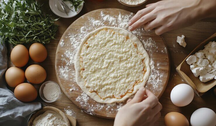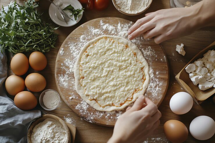 Чтобы приготовить тесто, смешайте кисломолочный напиток с мукой, дрожжами и солью. Если вы хотите добавить немного аромата, можете добавить сахар или специи. После смешивания дайте тесту подняться в течение часа или двух, в зависимости от температуры в помещении. Затем раскатайте тесто и выложите его в форму для выпечки.