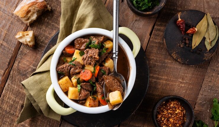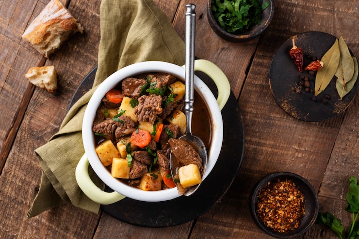 Теперь добавьте картофель и морковь, нарезанные кубиками. Уменьшите огонь и тушите, пока овощи не станут мягкими, а мясо не станет нежным.