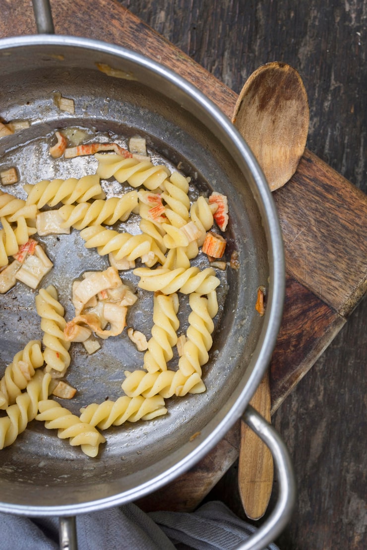 Как только макароны готовы, слейте воду, но не полностью. Оставьте немного воды в сковороде, чтобы создать соус из крахмала, который естественным образом высвобождается из макарон во время приготовления. Это добавит дополнительный вкус и поможет связать ингредиенты.