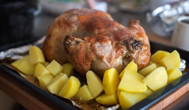 Поставьте противень в разогретую духовку и запекайте в течение 30-40 минут, в зависимости от размера кусков курицы и картофеля. Чтобы проверить готовность, воспользуйтесь термометром для мяса. Он должен показать температуру 75°C в самой толстой части курицы.