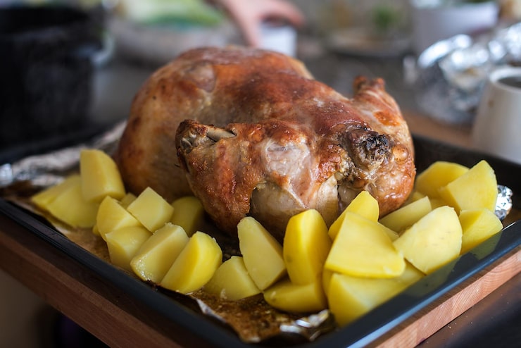 Пока курица маринуется, подготовьте противень для запекания. Застелите его фольгой или пергаментной бумагой, чтобы облегчить очистку после приготовления. Разложите куски курицы и картофельные дольки на противне, стараясь распределить их равномерно.