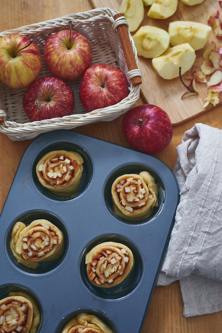 Пока тесто поднимается, приготовьте начинку. Вам понадобится 4-5 средних яблок, 1/2 чашки сахара, 1 чайная ложка корицы и 1/2 чайной ложки мускатного ореха. Очистите яблоки и нарежьте их тонкими ломтиками. В миске смешайте сахар, корицу и мускатный орех. Добавьте яблоки и перемешайте, чтобы они были равномерно покрыты смесью.