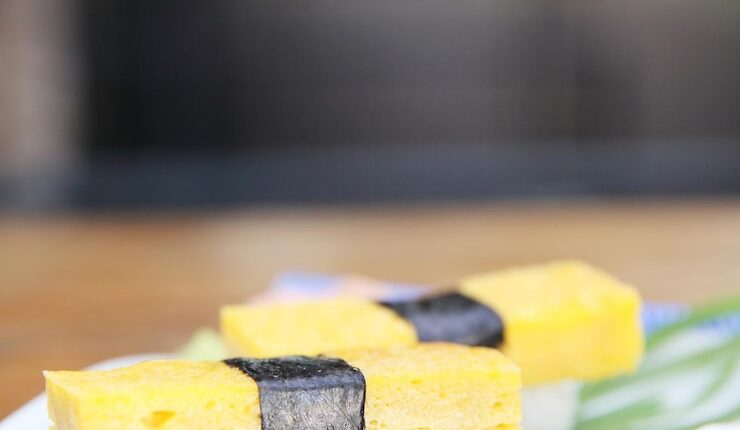 Подавайте яичное блюдо на тарелке, нарезав его на тонкие полоски. Это идеальная основа для ваших суши-роллов!