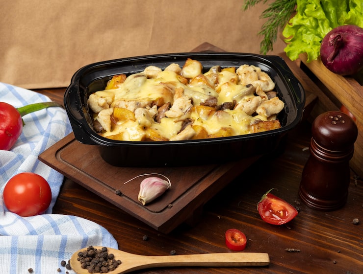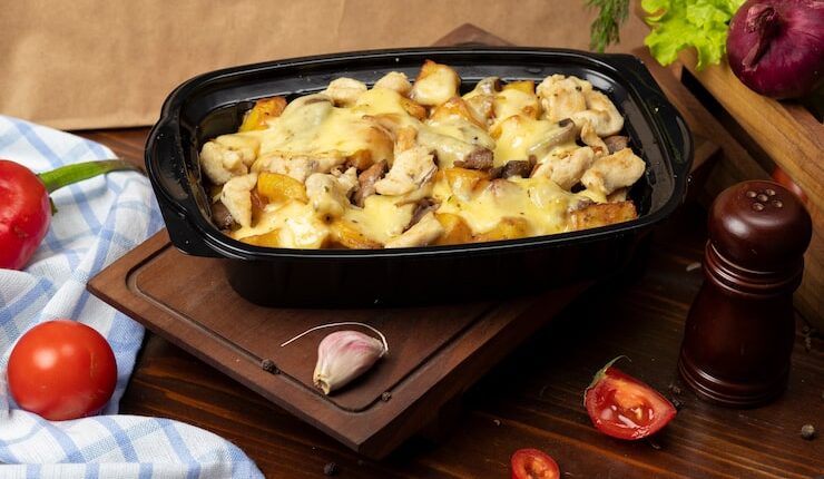 Запекайте блюдо в предварительно разогретой до 180 градусов духовке в течение 20-25 минут или до тех пор, пока картофель не станет мягким и золотистым. Перед подачей дайте блюду остыть в течение нескольких минут.